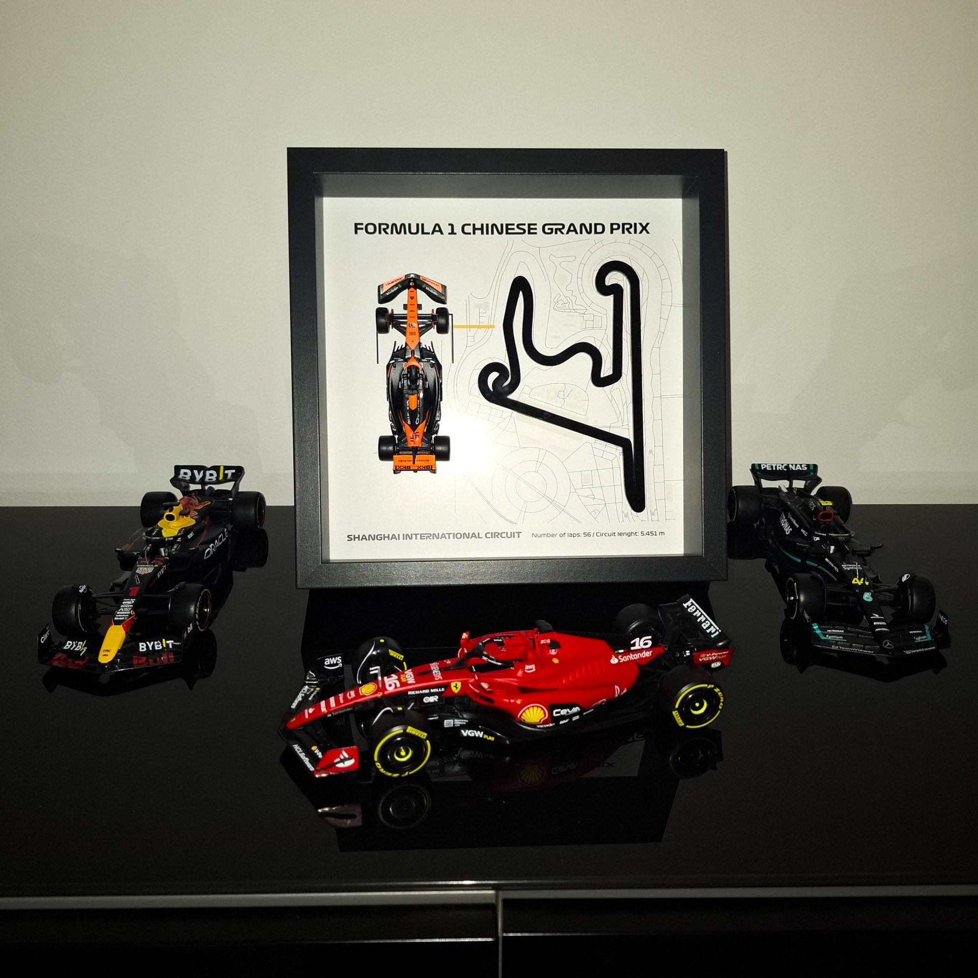 Floating above the car, the precision laser-cut plexiglass circuit adds depth and a striking 3D effect that brings the racing scene to life.